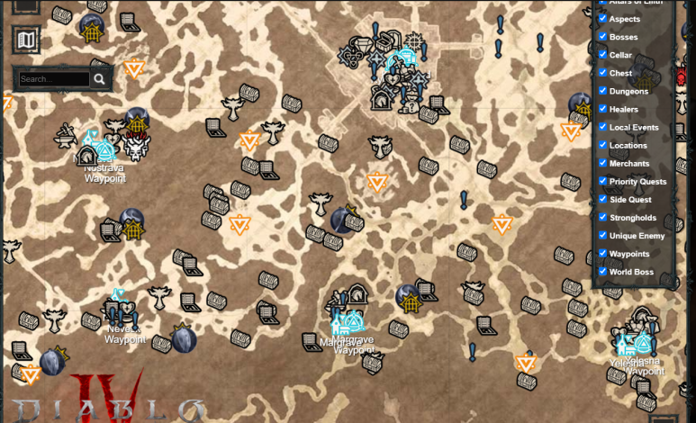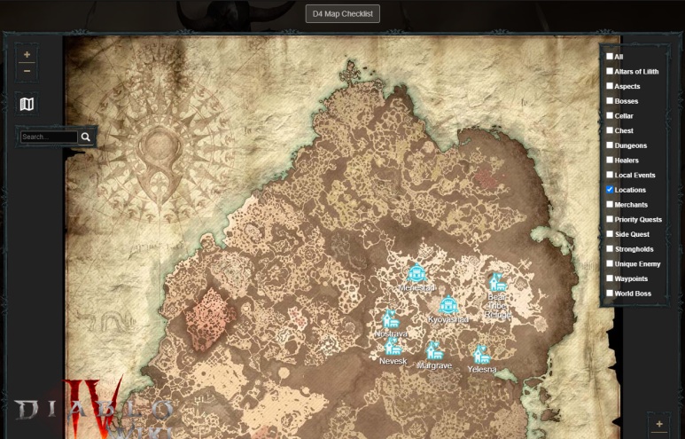 월드맵을 들어가면 아래와 같이 디아블로 지도가 나오고 체크리스트를 사용하여 원하는 항목에 대해서만 볼 수도 있습니다.