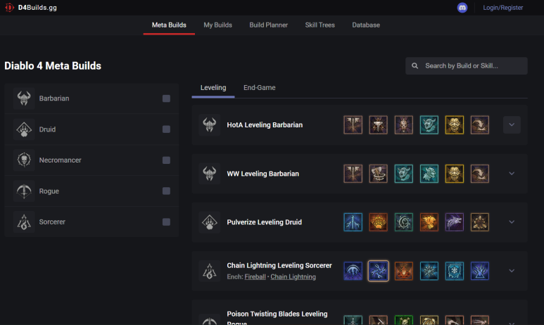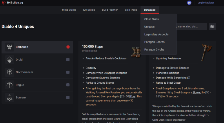 디 4빌드는 스킬 빌드 참고뿐만 아니라 wowhead처럼 스킬 트리를 미리 찍어볼 수 있는 페이지와 클래스 별 스킬 및 유니크 아이템들에 대한 정보를 볼 수 있는 데이터베이스 탭이 있어 꽤 괜찮은 사이트입니다.